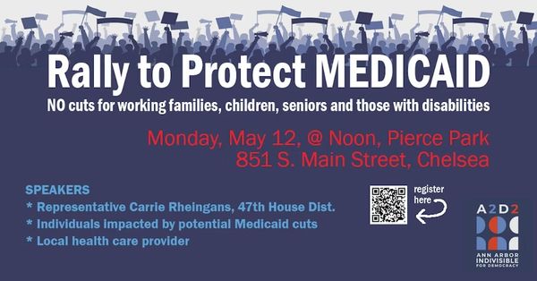 Ann Arbor inDivisible for Democracy (A2D2), a Washtenaw chapter of Indivisible and Swing Left, is hosting a rally to raise awareness of proposed cuts to Medicaid. These cuts threaten the well-being of our most vulnerable neighbors. The rally will include firsthand accounts from Michigan residents who will be directly affected by these cuts, highlighting the real-world consequences of such cruel po...
